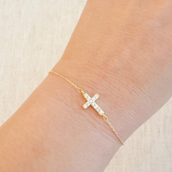 Delicate and meaningful, this side cross chain bracelet offers a modern take on a timeless symbol. Featuring a dainty cross set horizontally along a fine gold-tone chain, it adds subtle sparkle and elegance to everyday wear.